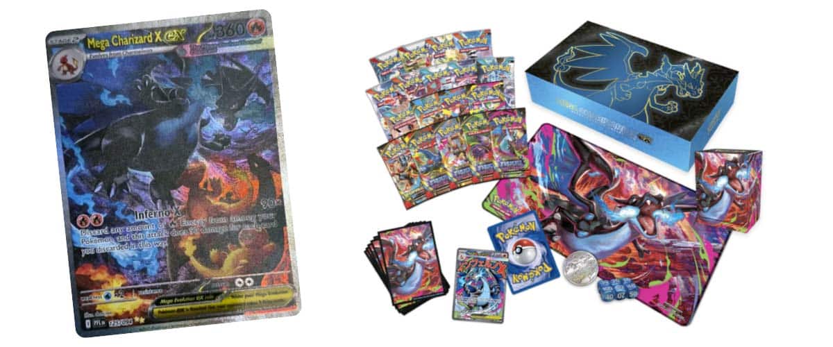 In concomitanza con l’espansione, verrà rilasciata una lussuosa collezione che include una carta promozionale Mega Charizard X-ex, tappetino da gioco, bustine protettive e un gran numero di buste di espansione.