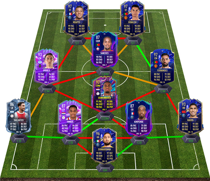 Davanti alla difesa tocca a un altro ajacide, Ryan Gravenberch, pezzo pregiato della prossima sessione di mercato, le nostre mezzali sono Renato Sanches versione UCL Live, tra centrocampisti più completi e incisivi di FUT 22, e Bruno Fernandes, con Paulo Dybala, l’uomo più chiacchierato del momento in casa Juve, a fungere da rifinitore (scambiatelo con Sanches in-game). La coppia d’attacco è quella che tutti sognerebbero, per la propria squadra di FUT ma anche nel mondo reale: Cristiano Ronaldo e Kylian Mbappé, il calciatore più influente dello scorso decennio e colui che punta a succedergli, guarderanno i quarti di finale da casa, ma vanno più che bene per crivellare di reti i nostri avversari virtuali. L’allenatore della nostra squadra è il discusso Maurizio Pochettino, utile per la combo nazionalità argentina+Ligue 1 che può portare l’intesa della nostra squadra fino a 98.